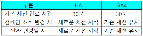 캠페인 소스가 변경되거나 날짜가 변경되었을 때 UA에서는 세션이 새로 시작되었으나 GA4 에서는 기존 세션이 유지된다.