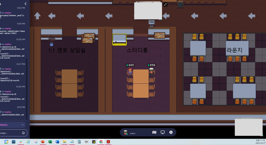 이번주에도 지난번에 같이 스터디 했던 분과 Gather town 에서 과제를 함께 했다.