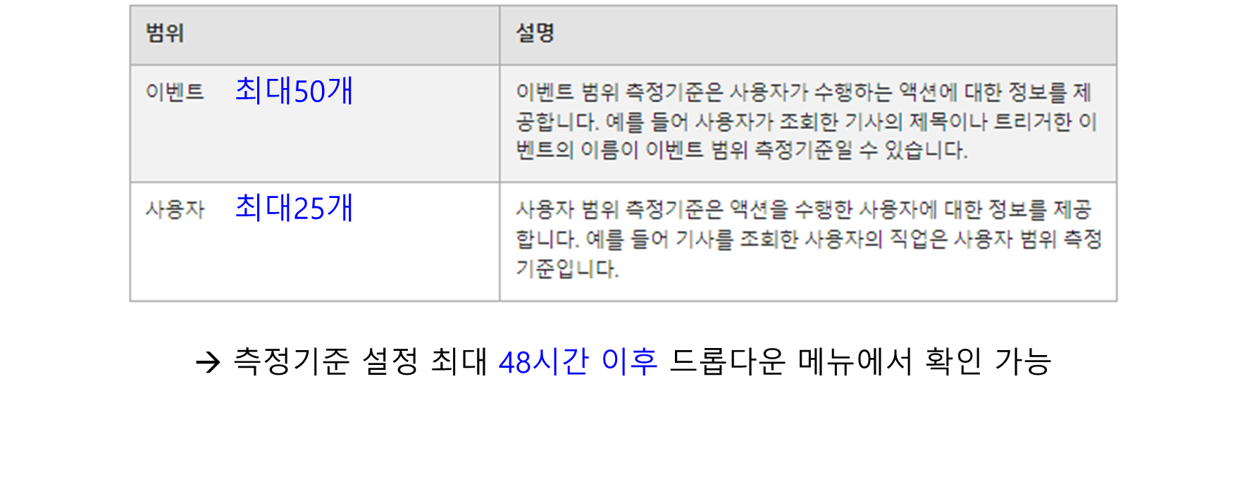 - 등록 후 리포트 드롭다운 메뉴에 새 이벤트 매개변수 또는 사용자 속성이 표시되려면 최대 48시간 소요