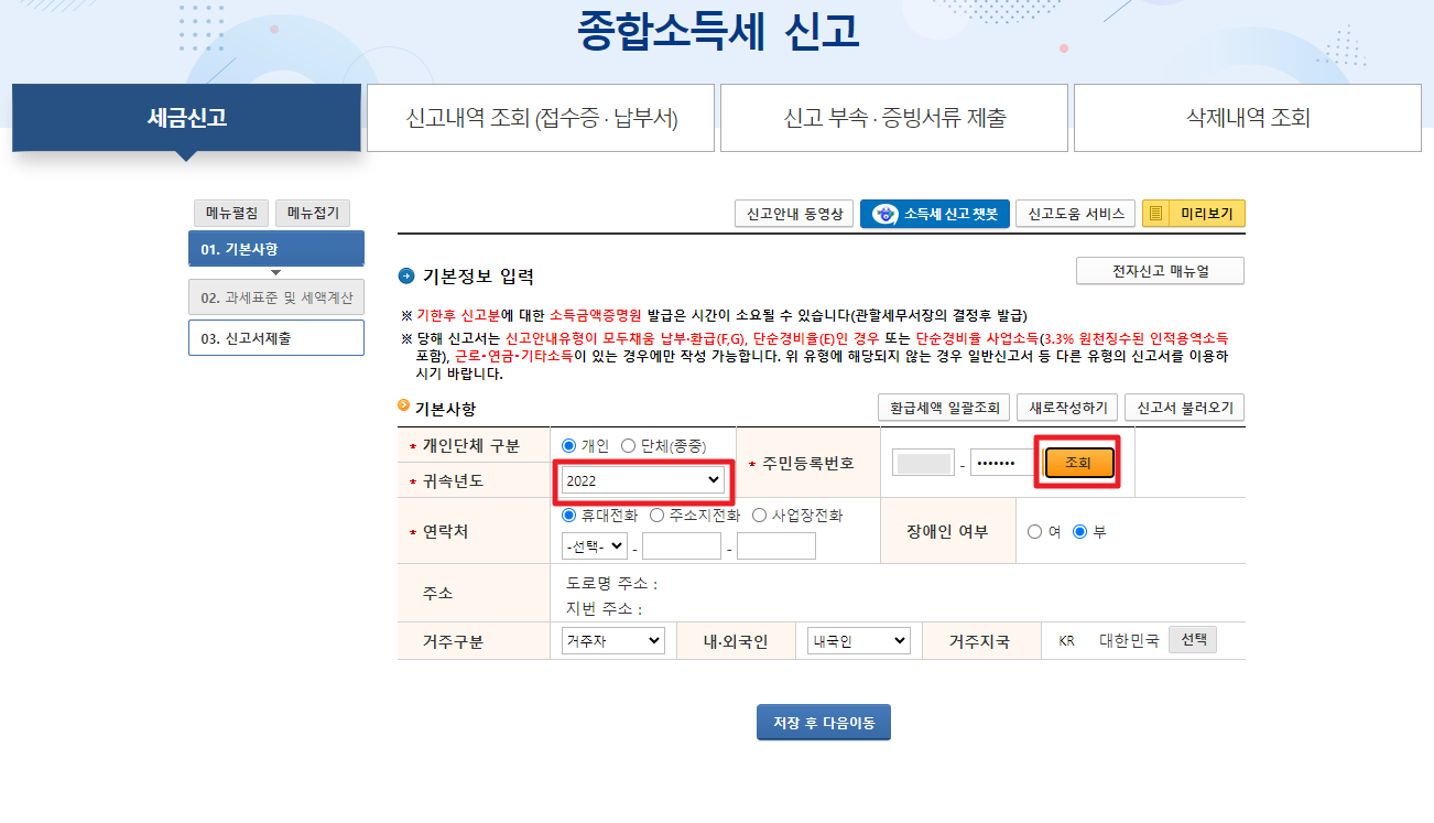 4. 귀속년도 (작년) 클릭 후 주민등록번호 조회 클릭 > 연락처 입력 > 저장 후 다음