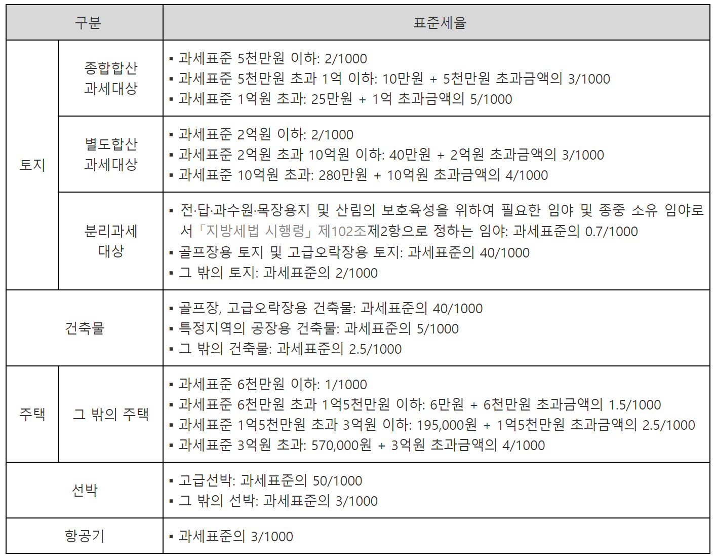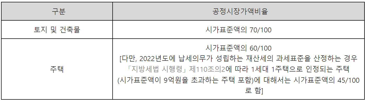 - 토지·건축물·주택에 대한 재산세의 과세표준은 공정시장가액비율에 일정퍼센티지를 곱하여 산정합니다.